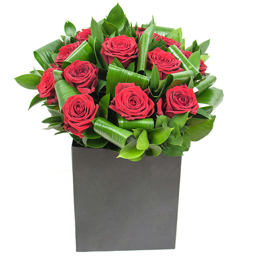 Admire the timeless elegance of our hand-selected red roses, complemented by aspidistra leaves and ruscus. This unique bouquet brings style and sophistication to any environment, making it an ideal gift.